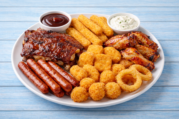 Охотничьи колбаски, свиные ребра, куриные крылышки, наггетсы, сырные палочки, креветочные шарики, соус барбекю и чесночный.