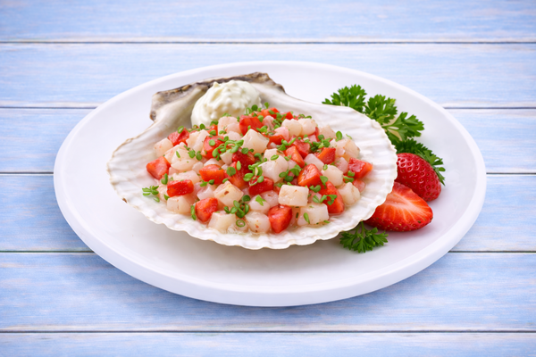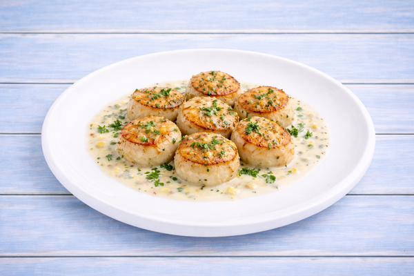 Подаётся с гребешком и красной икрой.