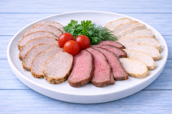 Ассорти из мясной нарезки буженина, ростбиф, филе курицы.