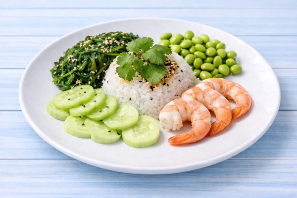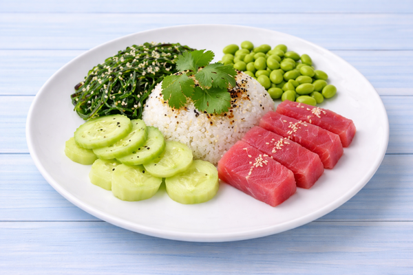 Рис с бобами, водорослями нори, огурцом и тунцом.