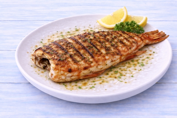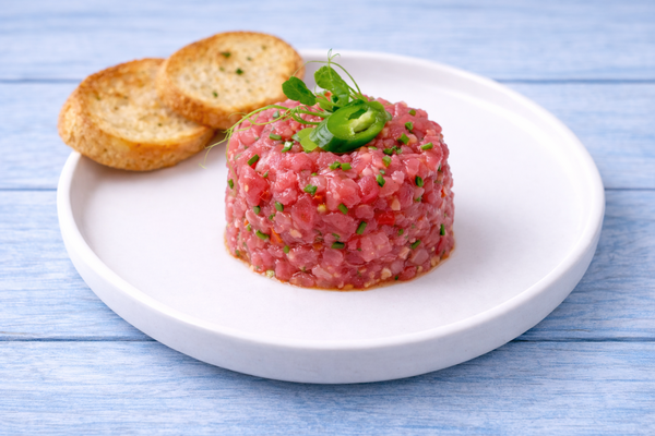 Подаётся с перепелиным яйцом и лимоном.