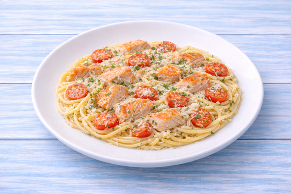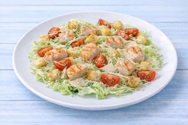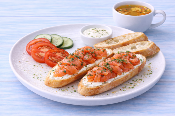Багет, слабосолёная сёмга (собственный посол), свежие овощи, крем чиз, белый соус, чай облепиховый.