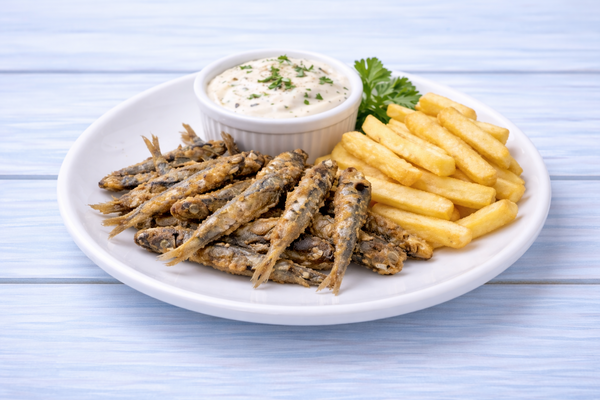 Анчоусы с чесночным соусом и картофелем фри.