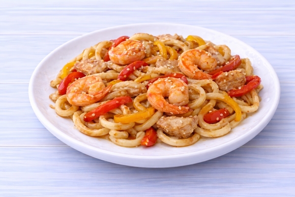 Удон с курицей и креветками