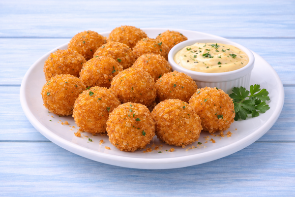 Креветочные шарики жаренные во фритюре с сырным соусом.